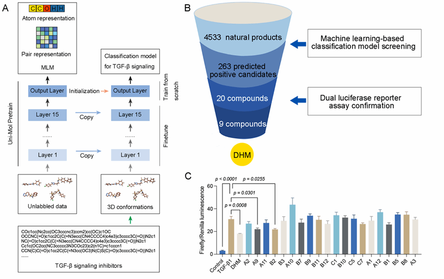 2025年10月28日,中国工程院主办的中国科技期刊卓越行动计划领军期刊《Engineering》(影响因子11.6)在线发表了中央民族大学国家安全研究院王昊教授团队与中国医学科学院医药生物技术研究所游雪甫、杨信怡研究员合作的最新研究成果。中央民族大学2022级博士研究生任一鑫(共同第一作者),基于迁移学习技术,自主构建了高效的TGF-β信号通路抑制剂筛选模型,实现从4533种天然产物到9个高活性化合物的精准筛选。该研究首次揭示了天然黄酮化合物二氢杨梅素通过抑制TGF-β/ALK5信号级联发挥作用的机制,为肺纤维化这一临床难治性疾病的治疗开辟了新型路径。