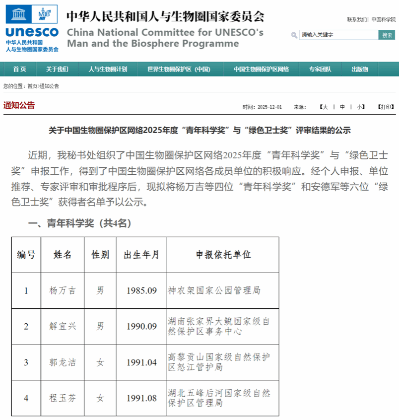 近日,我院“西部之光”访问学者、云南高黎贡山国家级自然保护区怒江管护局工作人员郭龙洁同志,荣获中国生物圈保护区网络2025年度“青年科学奖”。