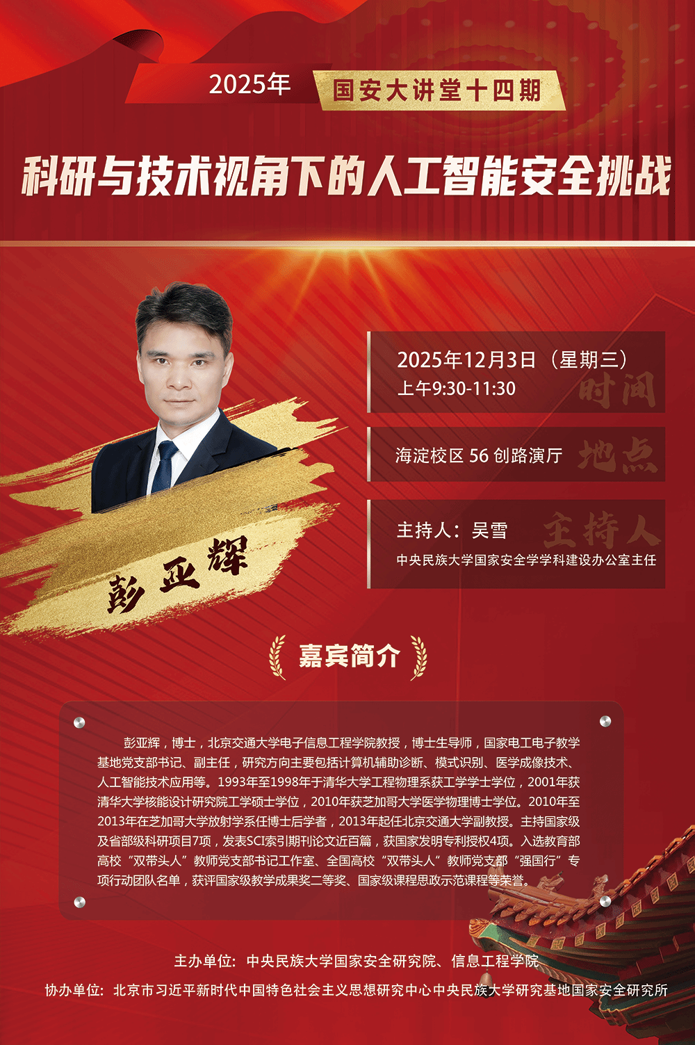 为国家安全与科技发展提供坚实支撑,构建兼具理论深度与实践效能的智能安全研究体系,中央民族大学国家安全研究院将于2025年12月3日举办“国安大讲堂”第十四期,具体安排如下: