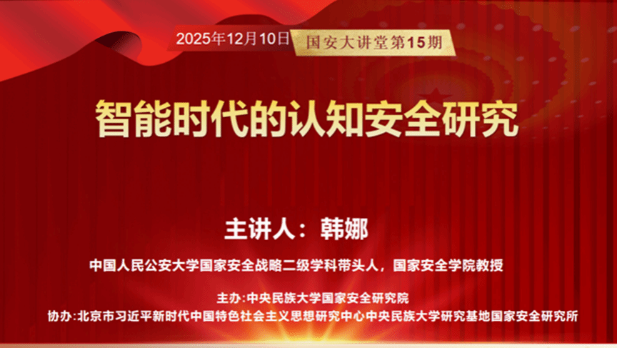 为积极应对人工智能时代下日益凸显的认知安全风险,进一步强化我校国家安全学学科在认知安全领域的学术研究与实践创新能力,中央民族大学国家安全研究院于2025年12月10日下午特邀中国人民公安大学国家安全战略二级学科带头人、国家安全学院韩娜教授在海淀校区文华楼西区707教室开展有关《智能时代的认知安全研究》专题讲座。本次讲座由国家安全研究院执行院长李俊清教授主持。