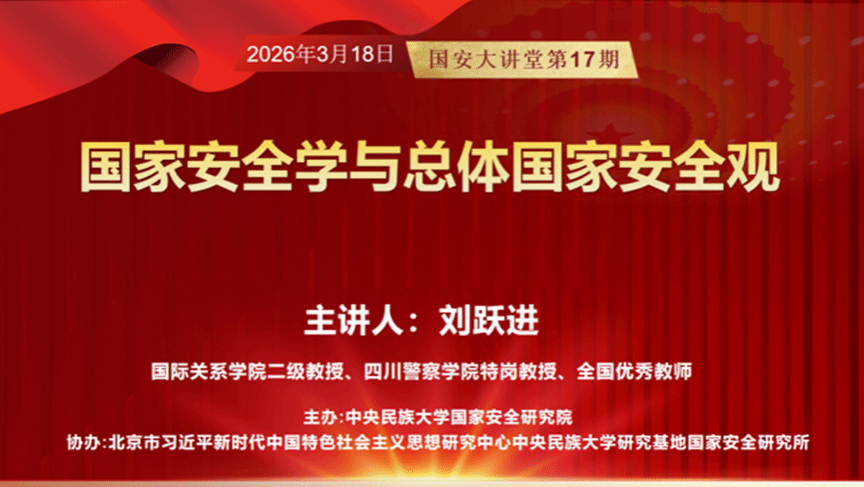 为推进我校国家安全学学科建设与理论研究,中央民族大学国家安全研究院于2026年3月18日下午举办“国安大讲堂”第十七期专题讲座。本期讲座特邀国家安全学领域知名专家、国际关系学院二级教授刘跃进作题为《国家安全学与总体国家安全观》的学术报告。